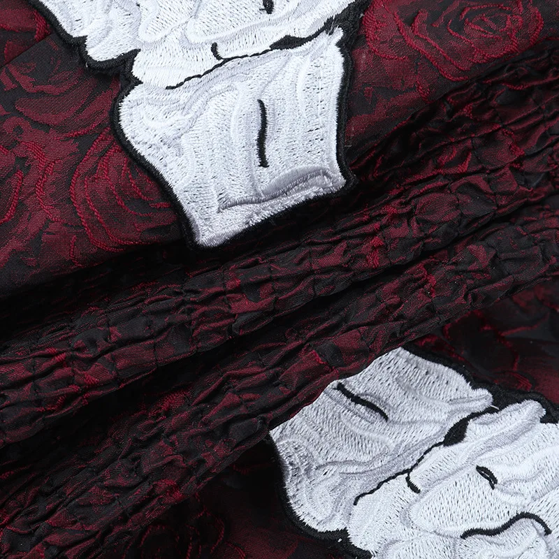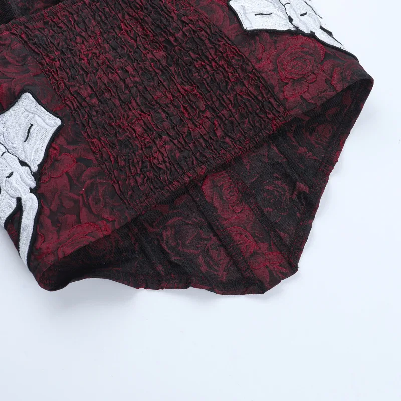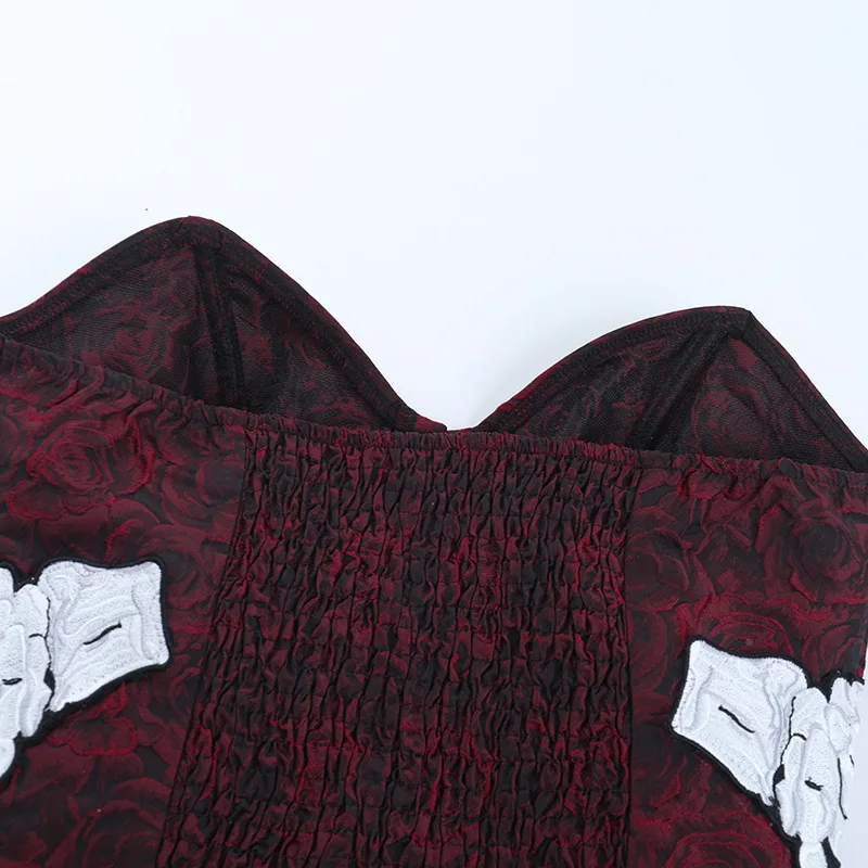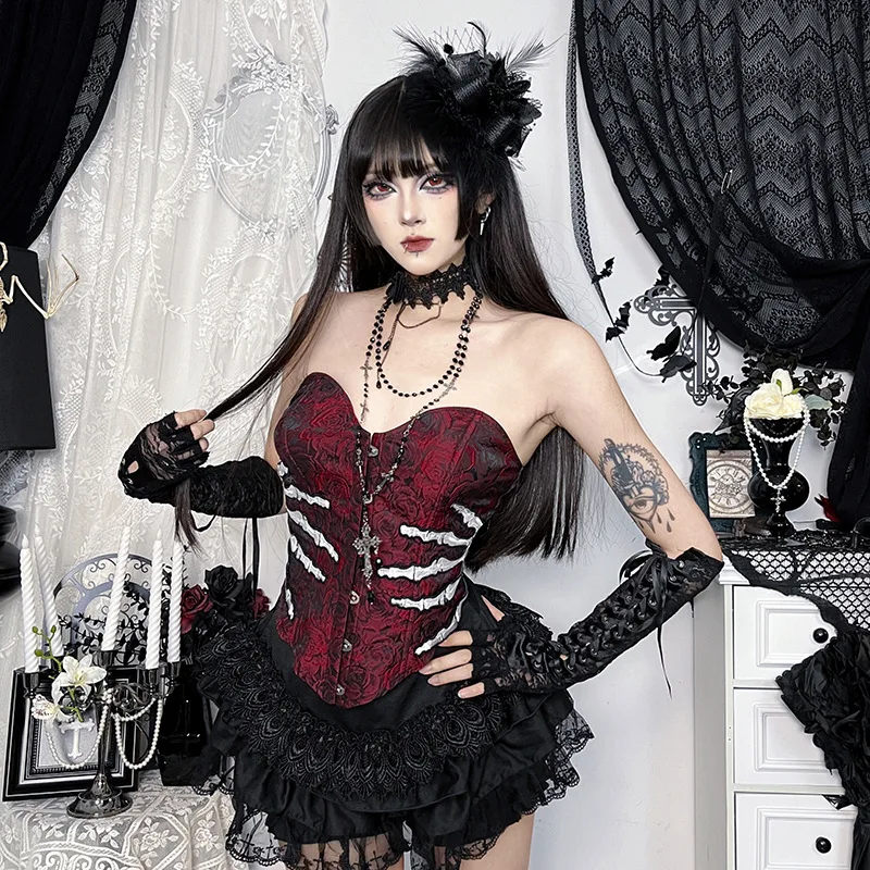 This particular corset top distinguishes itself through the incorporation of jacquard fabric. Jacquard weaving, a process that allows for intricate patterns to be woven directly into the fabric, adds textural depth and visual complexity. The patterns often associated with Gothic style, such as floral motifs, damasks, or subtle geometric designs, are rendered with precision, contributing to the garment's overall elegance and allure.